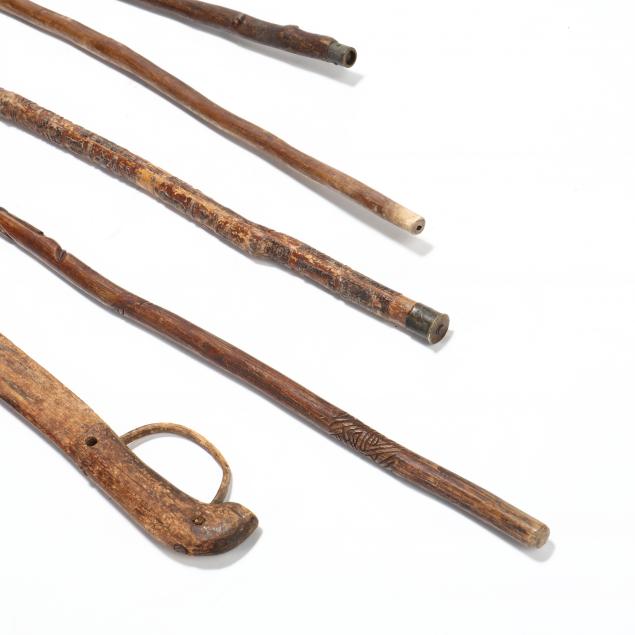 Late 19th - 20th century, all varnished or stained wood, to include: a well-made stick possibly dated with a "19" above a snake crawling up its shaft through a maze of ordinary objects such as a fence, a well head, a fountain pen, a Lime Cola bottle, a pen knife, a kerosene lamp, a cross, and more; the second is a knotty branch, its top end with a finely carved lady's face; the third, a plain stick with a carved and painted animal's head for the handle; the fourth, a straight stick with cryptic symbols and letters indicating a possible fraternal association; the fifth item being a short wooden sword having a knuckle bow guard.