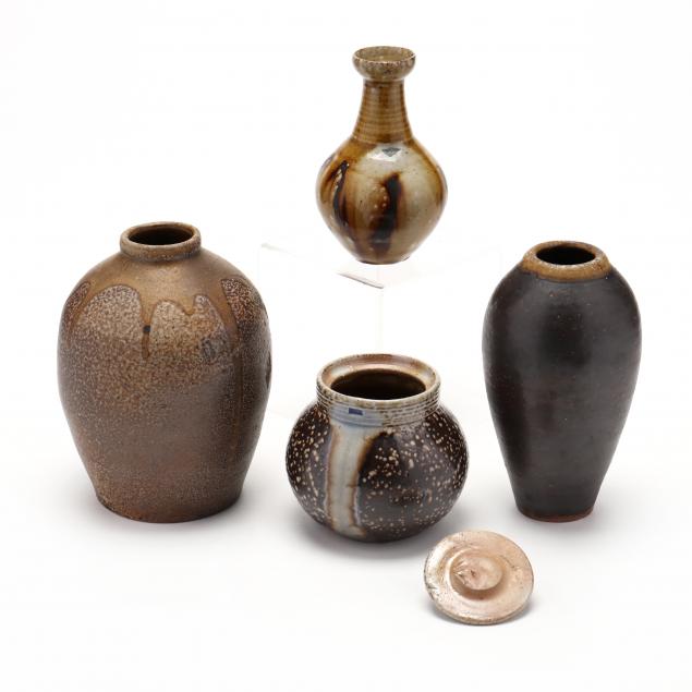 Each signed to underside, to include: first a bulbous salt glazed vase, May 2007 firing (6.25 in.); second a vase (6 in.) and small salt glazed covered jar (4in.), each signed "WMH / D" for Mark Hewitt's apprentice Daniel Johnston (1997–2001); the fourth a small vase, unmarked, attributed to Mark Hewitt, with golden and umber drip glazes to body (5 in.).