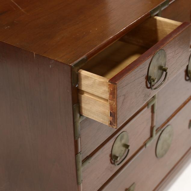 Late 20th century, walnut, low profile chest with six various sized drawers, brass pulls on short block feet.