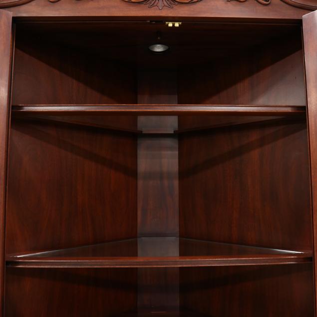 Late 20th century, one part lighted form, finish no. 29, broken arched scrolled pediment with three removable finials, upper cabinet with two hinged individual paned doors with fitted glass shelf interior, lower cabinet with two hinged raised panel doors with shelved interior, on ogee bracket feet, labeled.