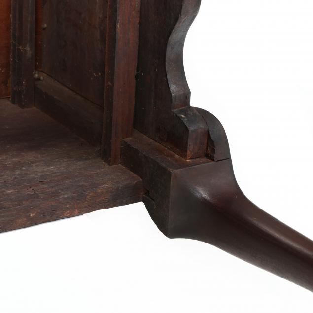 Attributed to Maryland or Delaware, circa 1760, poplar secondary, two-board rectangular top with molded edge and rounded front corners, the case with three side-by-side lipped drawers, shaped and scalloped skirt with central diminutive demilune drop, flush paneled scalloped side panels, cabriole legs with carved Spanish foot on pad.