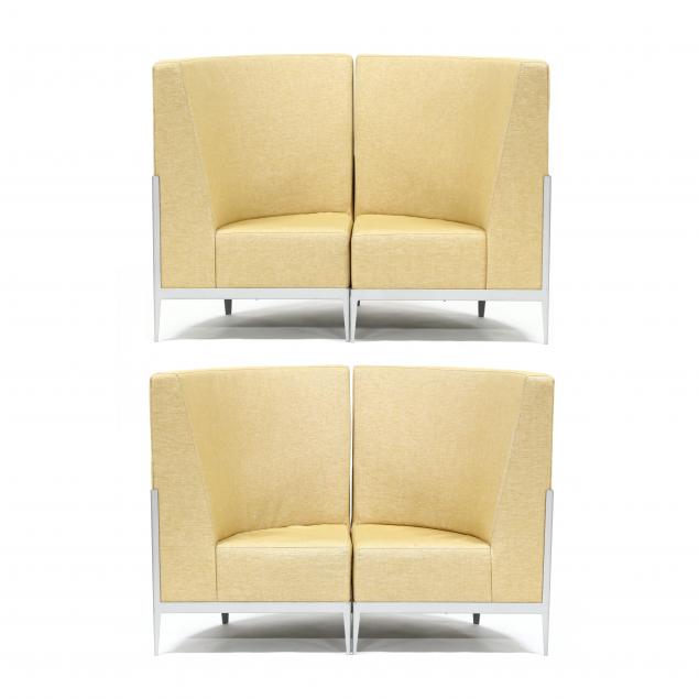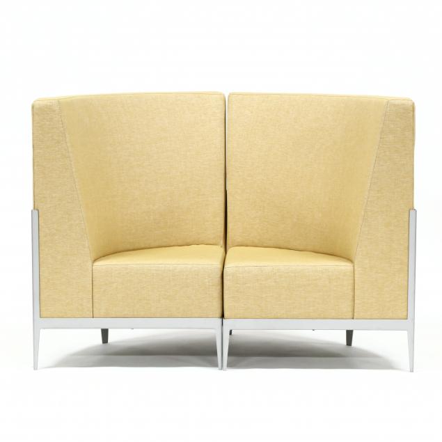 Contemporary, designed by Mitch Bakker of IDa Design, unmarked, 4 part form, light ochre fabric, frame in a soft chrome with textured powdercoat finish