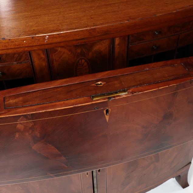 Attributed to Eastern Virginia, early 19th century, poplar secondary, top with applied molded edge, pull-out fall front butler's desk, unusual horizontal document drawer within fall front lid, interior prospect door with inlaid conch shell opening to reveal two small drawers above two pigeon holes, flanked by three small drawers to each side above four open pigeon holes, prospect door flanked by two faux document drawers, above two hinged bowfront cabinet doors, each with highly figured mahogany veneers, banded veneer border and light and dark wood inlays, opening to reveal three conforming bowfront linen drawers, triple line inlaid base above a scalloped apron, raised on front French bracket feet.