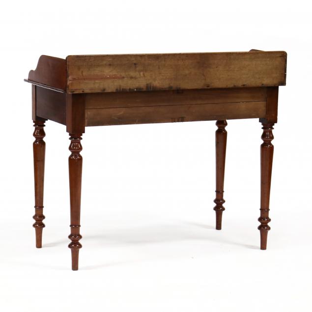 Circa 1840, oak and pine secondary, dovetailed backsplash, two flush drawers raised on turned and tapered legs.
