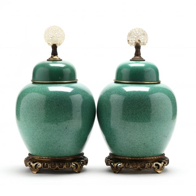 Early 20th century, mark of Carlton Ware, manufactured by W & R of Stoke-on-Trent, with gilt metal mounts, each domed metal cover painted to simulate the powder glaze of the jars, surmounted by pierced carved hardstone finial.