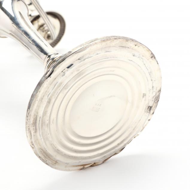 Model number 375, convertible five light form with varying heights, gadroon edges to bobeche, drip pan, knop, and base, weighted, no monogram.