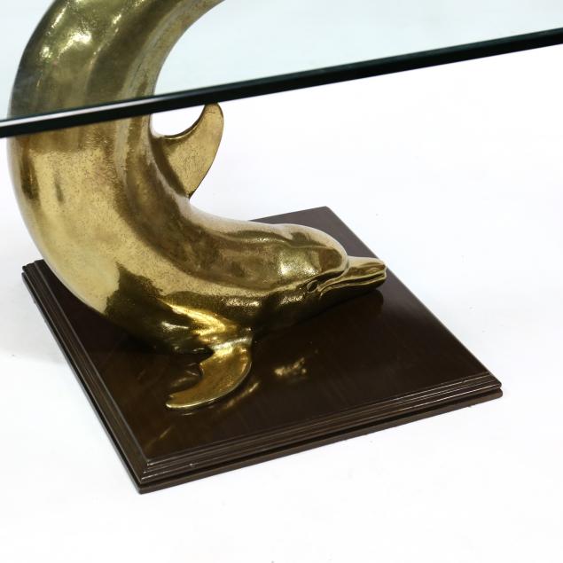 Italy, 1970s, thick rectangular beveled glass top set on two cast brass dolphins marked "Cernese" to underside of tails, mounted to wood plinths.