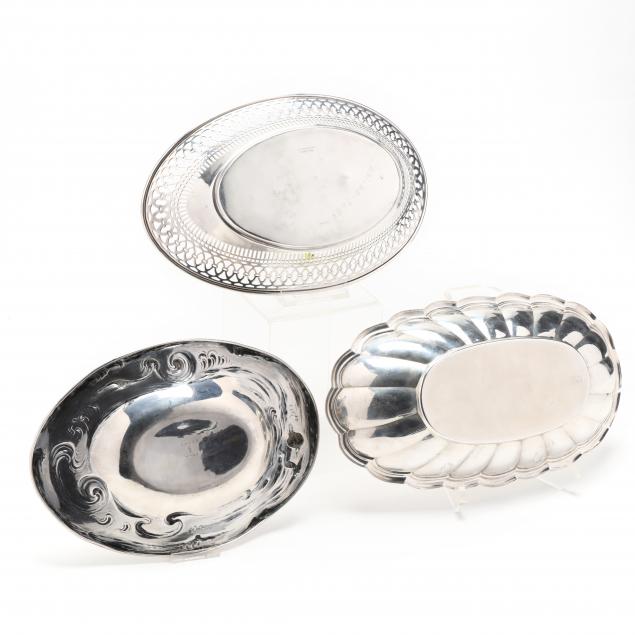 The first a reticulated basket, marked by C. Lumsden & Son of Richmond, VA (1881-1932), model number 3038 (10.25 x 6.5 in.) (one dent to base with light surfacne scratches) ; the second fluted dish, marked by Fisher Silversmiths Inc., model number 2260 (11.5 x 6.25 in.) (some scattered scratches to interior and underside); the third an Art Nouveau dish by International Silver Co., with repoussé mermaid and wave decoration, model number C 2884 (9.25 x 6.5 in.) (light scratching to interior and underside)