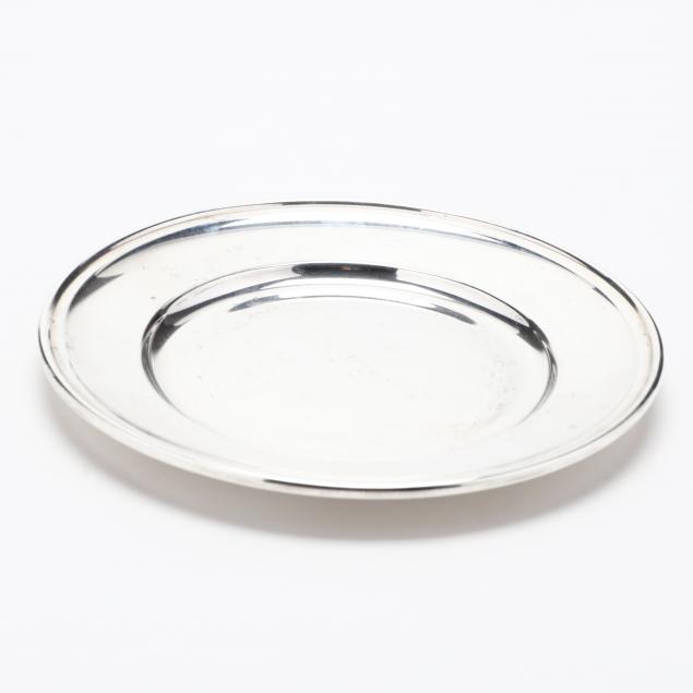 To include: pair salt and pepper shakers by Gorham, model number 1113, with finial lid and pedestal base, no monograms (HOA 4.5 in.); cigarette urn, marked sterling to underside without hallmark; bread plate by Gorham, model number 10 (6 in.).