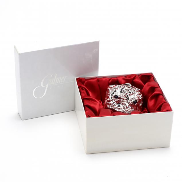 Featuring two chrysanthemum blossoms set with cabochon synthetic sapphires, 24KT gold plating to interior, marked "Galmer / New York / 925 Sterling Silver," with original satin lined presentation box.