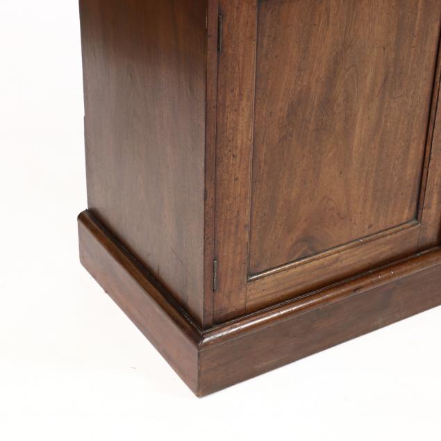 19th century, two part form, pine secondary, molded pediment with line inlaid frieze, two hinged astragal molded doors with individual panes open to reveal a a dark red painted shelf interior, lower cabinet with applied reeded edge, single flush drawer over two hinged paneled doors with shelved and drawered interior, flush base.