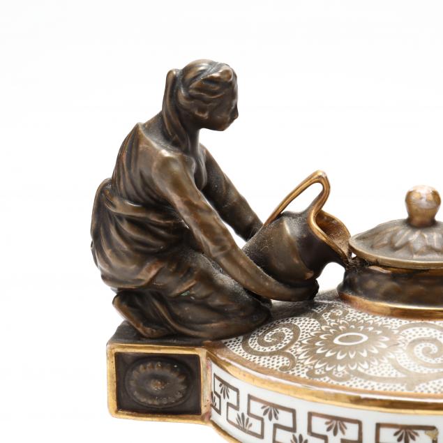 Late 19th century, in the style of the Persian Sejut lamps raised on pedestals, each with decorative band Greek key design and oval cover, unmarked.