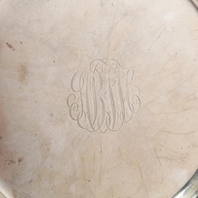 The first a small tray with mark of Webster (6 7/8 in. diameter) (scattered pinpoint dents); the second a bottle coaster or decanter stand by Towle (good estate condition); the third a cake plate by S. Kirk & Son (10 1/8 in. diameter) (good estate condition); and the fourth a tray by Towle (10 in. diameter) (good estate condition). Each with assorted period script monogram.