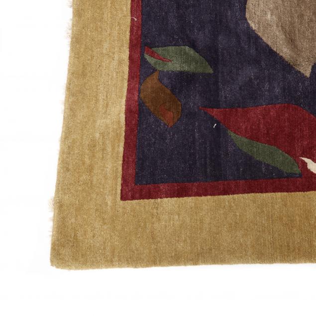 With Odegard label, blue field with bold multicolor leaf design elements, with gold border.