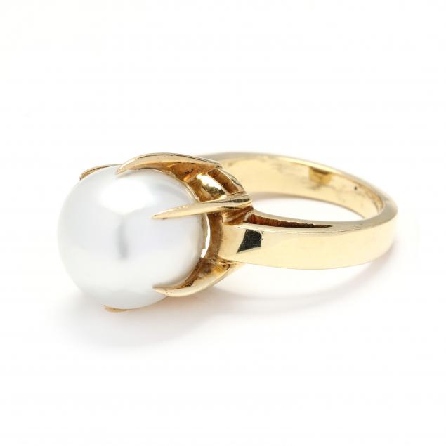 Centering on a round cultured pearl (12mm) in a tall prong setting, band with open shoulders and inscribed 18K.