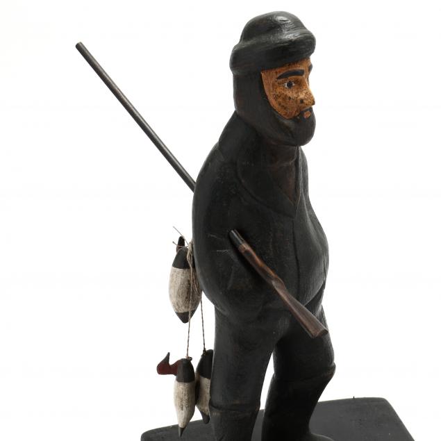 Both untitled and unsigned, the first depicts a hunter carrying his rifle and a string of duck decoys, raised on a square plinth (HOA 17 in.); the second carving has two owls inserted into an actual branch and flaked by twig trees (111/2 x 11 x 6 in.).