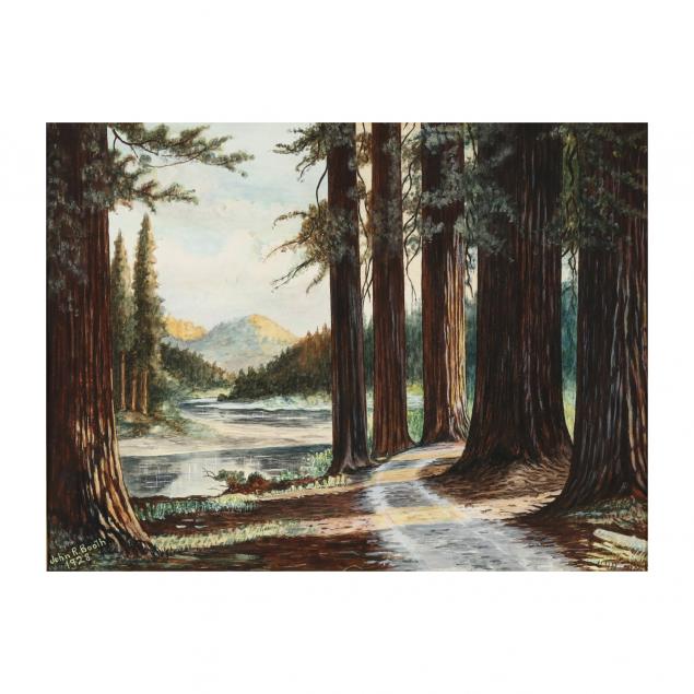 Watercolor and gouache on paper, signed "John R. Booth" and dated 1928 to lower left, matted and framed under glass.