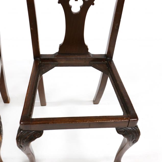 Early 20th century, mahogany, each with blue toile upholstered slip seats, pierced backs, acanthus carved knees on ball and claw feet.