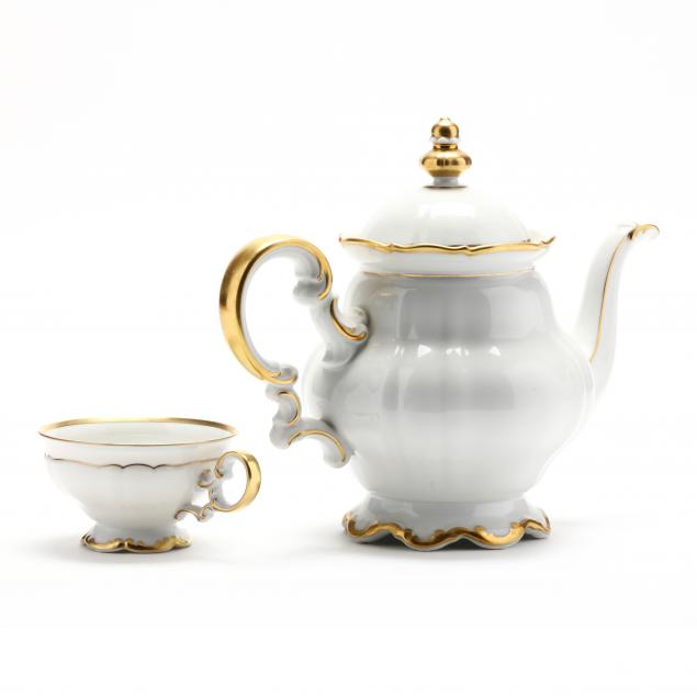 (46) pieces, white field with Rococo Revival gilt trim, (8) plates, (10) salad plates, (11) cups, (9) saucers, (7) bread plates, and a teapot (8.75 in.).