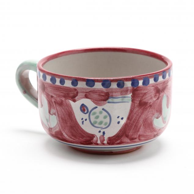 Made in Italy, four each dinner plates (10 in.); salad plates (8 1/4 in.); saucers; cups, colorful rims decorated with reserves of birds.