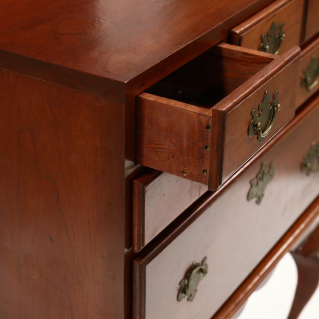 Mid 20th century, two part form, the case with three over two over one drawer on a cabriole leg stand, labeled "Turkey Hill Reproductions."