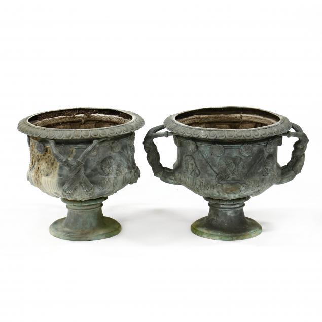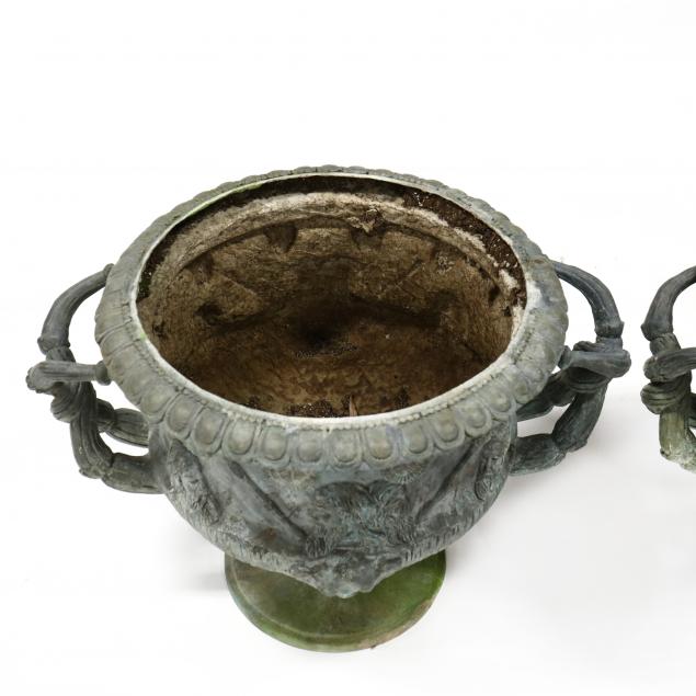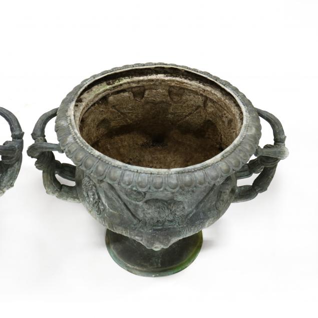 Late 20th century, cast and patinated bronze with a beaded and egg and dart rim, intertwined double handles with mask and torch decoration, appears unmarked.