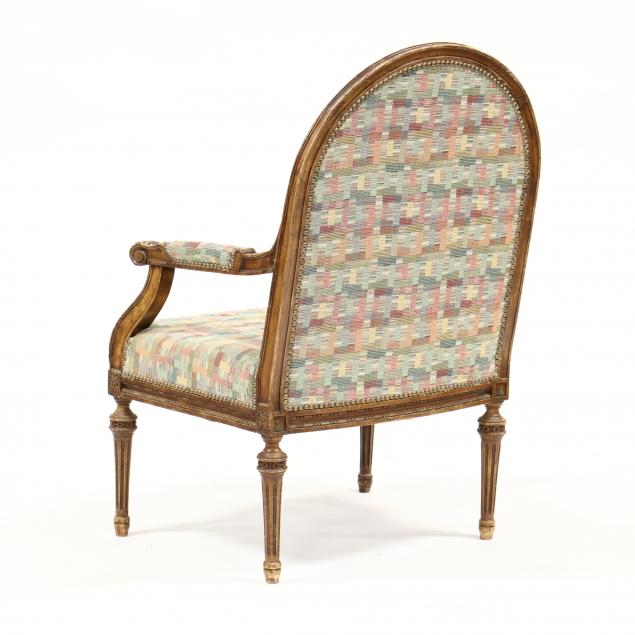Late 20th century, labeled Banks, Coldstone Co., laurel leaf carved wood frame, multi color upholstery with brass nailhead trim on tapered fluted legs.