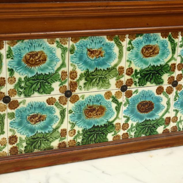 Early 20th century, mahogany, carved backsplash framing ten floral majolica tiles, the cabinet with a white marble top, single hinged paneled door on ring turned legs.
