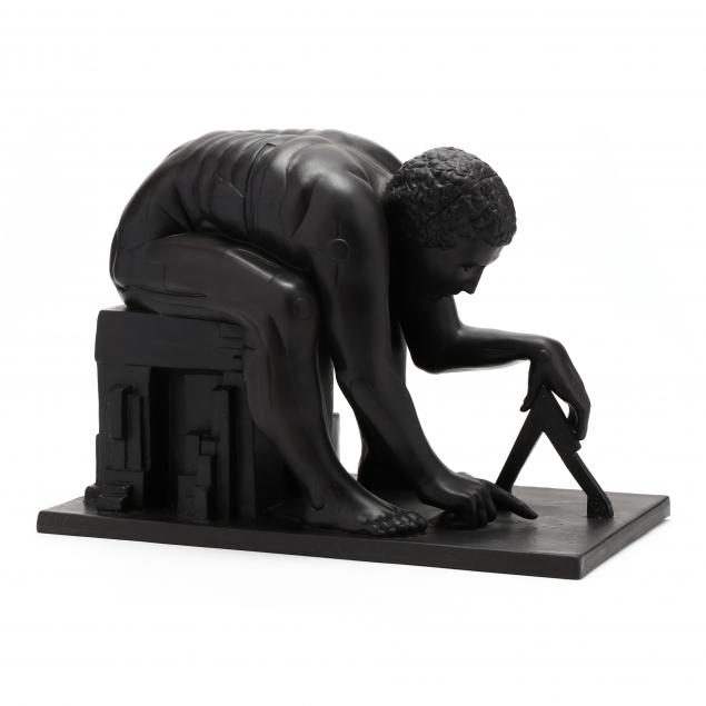 Limited Edition #14 of 50, produced in black basalt, this s a copy of the Sir Eduardo Paolozzi bronze for the British Library. It depicts Newton seated and bending forward to plot the universe with a pair of dividers. Signed in mold above an identifying Wedgwood plaque date 1997.