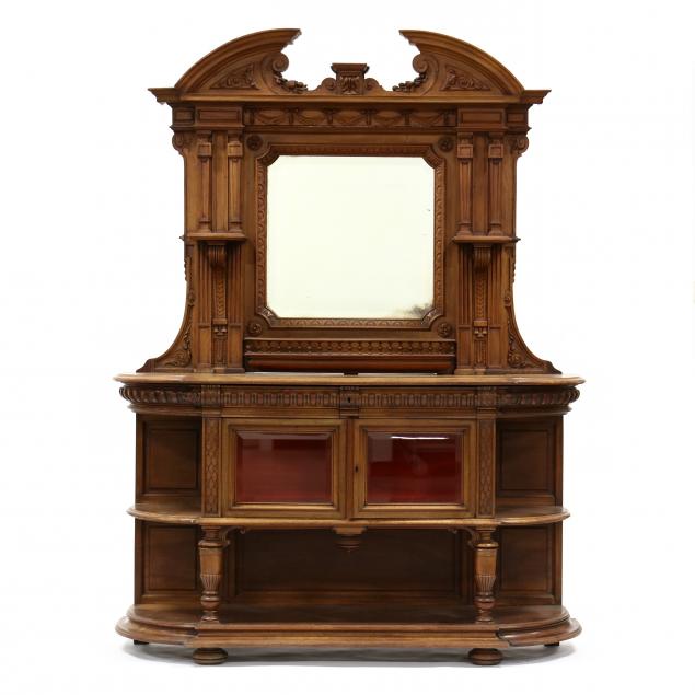 Late 19th century, two part form, fruit wood (possibly cherry) secondary wood; tall mirrored backsplash with central, shaped and beveled mirror surmounted by a broken arched pediment, flanked by two bracket shelved with scroll supports and lower spindle gallery dish shelf, the case with two gadrooned drawers over two hinged beveled glass doors, with beveled glass sides, red fabric lined interior, flanked by two shelves over one lower shelf raised on disc feet.