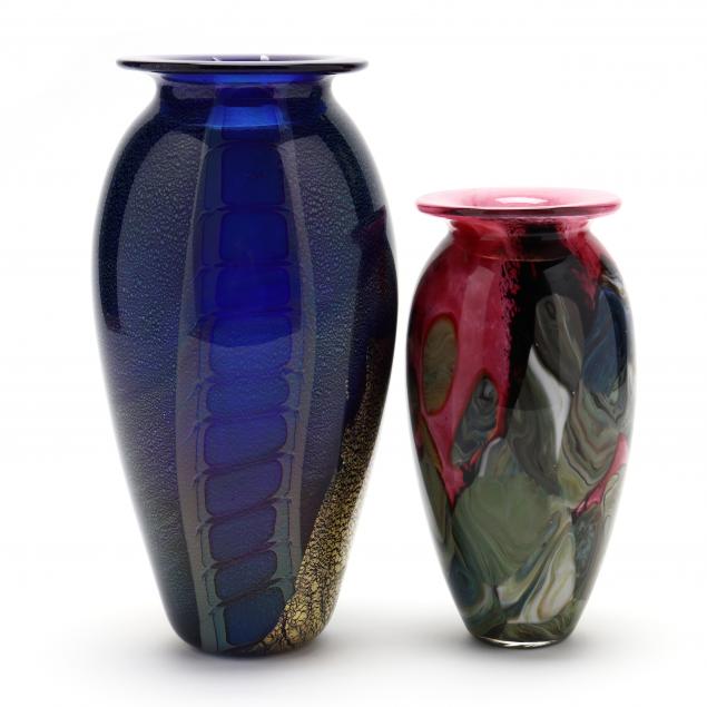 Handblown, the larger in blue with iridescent green and gold tones, with vertical reptilian ribbon pattern, signed and dated 2009 to underside (10.5 in.); the smaller in magenta/olive/blue/and black agate pattern, signed and dated 2001 to underside (8 in.)