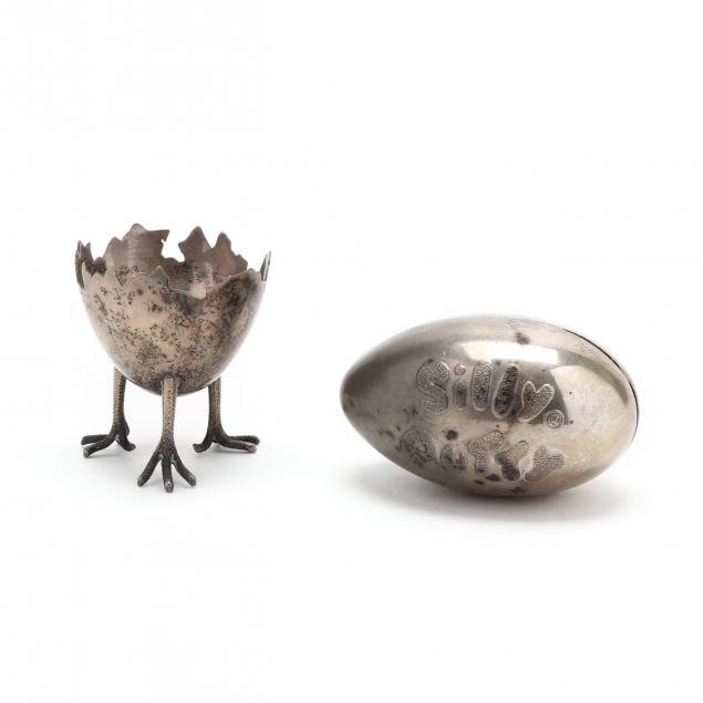 The egg retailed by Neiman Marcus in 1990 to commemorate the 50th anniversary of the beloved toy, the egg is marked for Peter Brams Designs of New York (2 in., 1.565 troy oz.); the egg cup with late 19th century Russian hallmarks, .84 zolotniki, unknown maker, with naturalistic "cracked" shell and raised on three chicken feet, no monogram or engraving (1.75 in., .645 troy oz.)