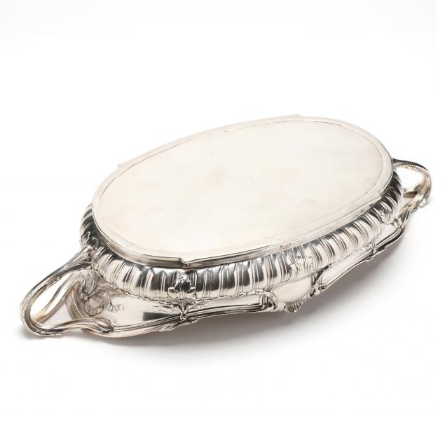 Paris, late 19th century, with the marks of Victor Saglier and Saglier Frères, in the Neoclassical style with whip curve double handle, gadrooned ovoid body below a garland border with centered cartouches to each side, includes original removable ring handle liner.