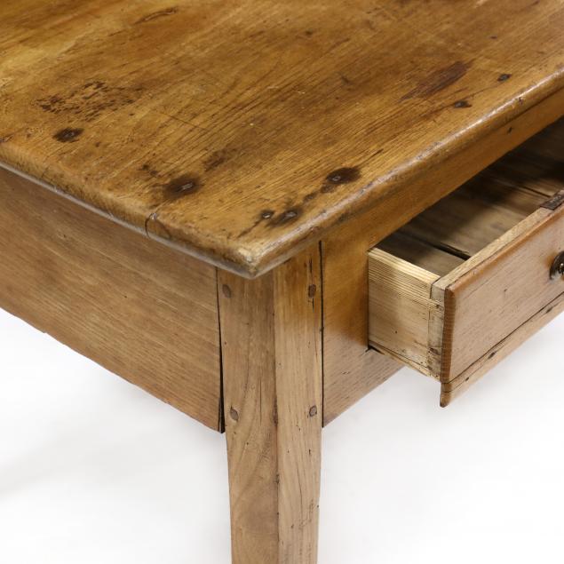 19th century, pine secondary, large single board top with rounded edge, two lipped drawers on square tapered legs.