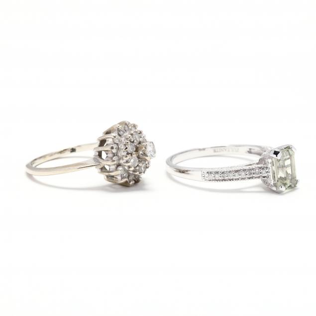 To include: a cluster ring featuring a stepped dome of prong set full and single cut round diamonds weighing approximately .36 total carat (K-L color, I clarity), stamped 14K and with indiscernible mark (11.3mm x 11.4mm; ring size 5.5); and a ring centered on a prong set emerald cut zultanite, shoulders with single cut round diamond melee weighing approximately .08 total carat (K-L color, I clarity), marked Zultanite Thailand 14K (ring size 7).