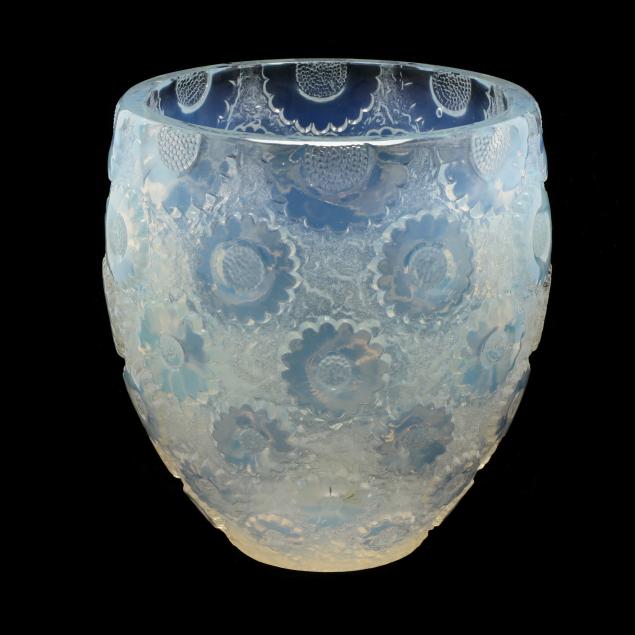French, 1934, molded opalescent crystal with raised repeating floral design, the underside marked "R. Lalique."
