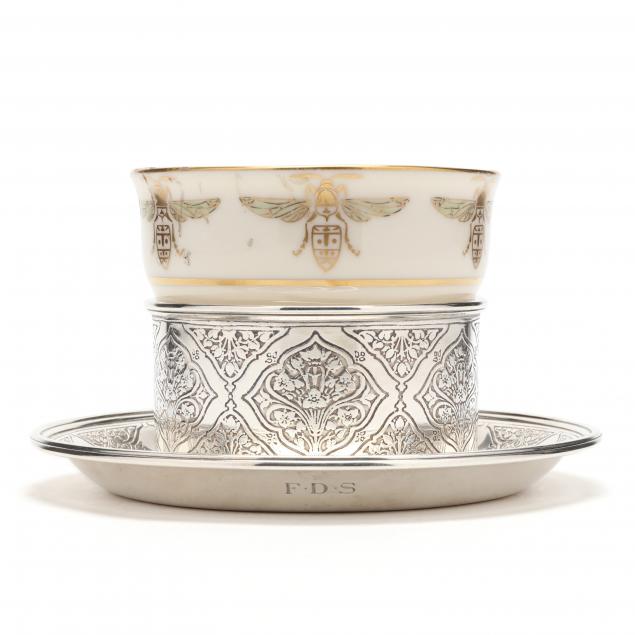 Circa 1907-1947 period hallmark, pattern number 17336A, ornate acid etched arabesque design, with period monogram "FDS" to underside of integral drip tray; complete with the original Lenox liner with Egyptian style honeybee design, lacking cover.