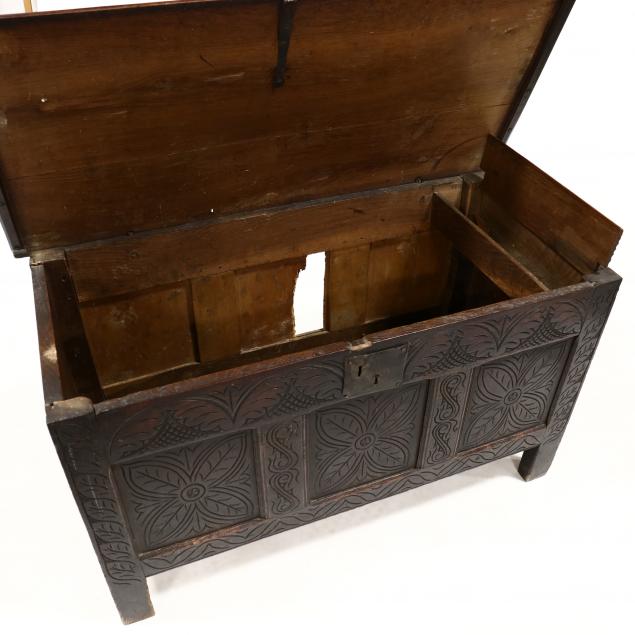 Late 17th century, two board top with molded edge, snipe hinges, interior with chip carved lidded till, triple panel front with incised carving, iron clasp and lock, relief carved paneled sides on straight feet.