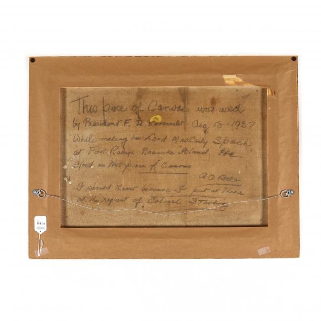 "This piece of canvas was used by President F. D. Roosevelt - Aug 18 - 1937 while making his Lord MacCauly Speech at Fort Raleigh, Roanoke Island. / He stood on this piece of canvas / [A. Q. Bell?] / I should know because I put it there at the request of Colonel [Starling?]", in painted and gilt frame.
