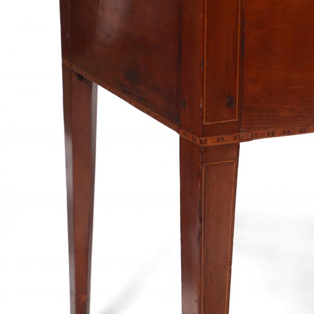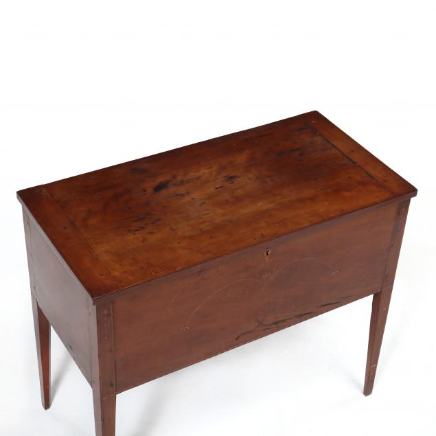 Southwest Virginia or Tennessee, early 19th century, poplar bottom with oak back board, hinged top with breadboard ends and applied molded edge, open interior (now lacking central divider), front panel with entwined vine and flower, stiles with inlaid drop dot and bellflower, base of case with alternating light and dark wood inlaid band, raised on tall square tapered legs with inside chamfer, light wood line inlay and inlaid cuff.