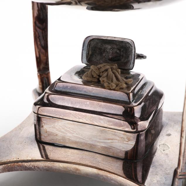 First half of 19th century, unmarked, foliate scrolled double handles, berry pattern to upper rim borders, and figural portrait mounts above four legs, burner with wick hinge cover to base on four ball feet.
