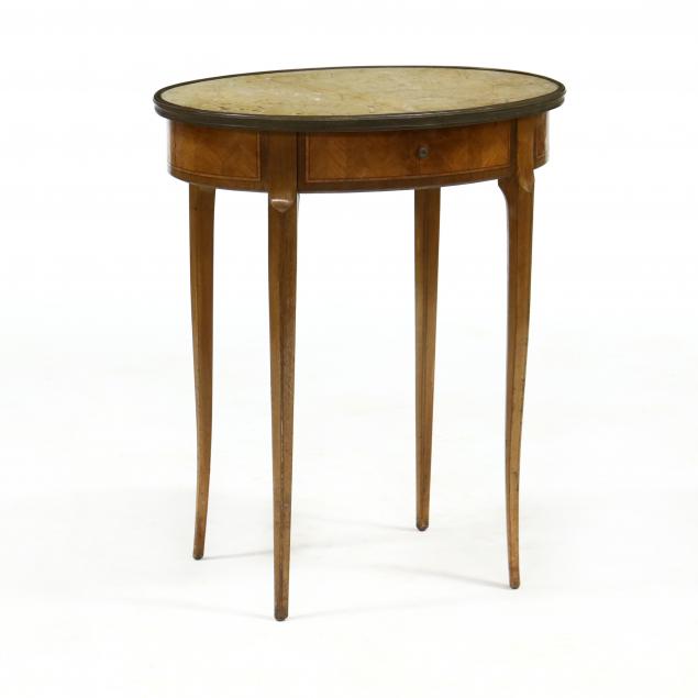 Early 20th century, oval marble top with ormolu trim, single curved drawer with walnut herringbone veneers, on tall cabriole legs, labeled to interior of drawer.