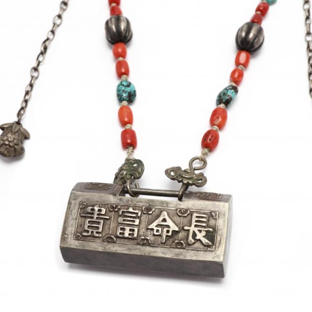 Qing dynasty (1644-1912), a link chain with turquoise and coral beads at bottom, two bat charms hook onto a rectangular lock decorated with Chinese characters to one side and figures to the other, two link chains dangle from beginning of beads and have auspicious charms at the ends.