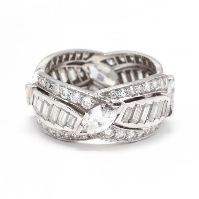 The band with scalloped detailing and set with four central marquise cut diamonds weighing approximately 1.40 total carats (G-H color, VS clarity), with channel set baguette cut diamond stations to center weighing approximately 1.58 total carats (G-H color, VS clarity) and with two outer bands of full cut round diamonds weighing approximately 1.32 total carats (G-H color, VS clarity), stamped Plat. Total diamond weight approximately 4.30 carats.