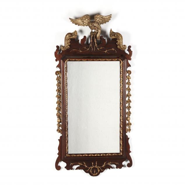 Mid 20th century, well developed frame with relief carving and gilt highlights featuring a spread winged eagle pediment, gadrooned fillet, pierced carved stiles, appears unmarked.