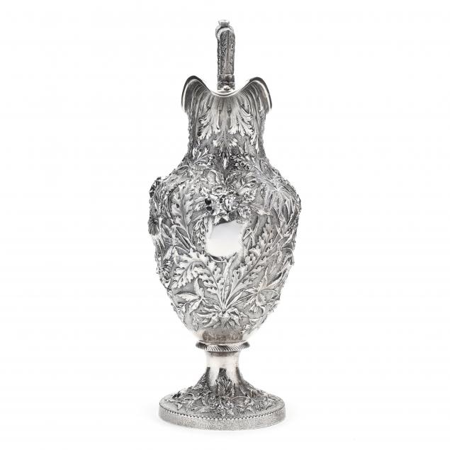 Circa 1850-1860, marked, flora and foliate design against a stippled ground, the conforming foot ring with stippled coral style decoration, the cast handle with further repoussé and chasing and featuring a finely detailed ram's head to terminus.