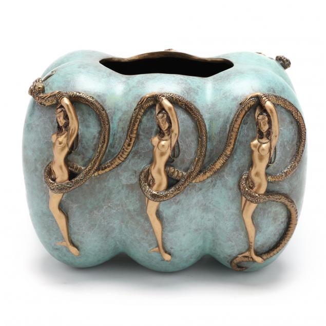 1980, patinated and gilt bronze with raised snake charmer figural decoration to both sides, marked to underside "Seven Arts FP VI" and with artist's signature in the casting.