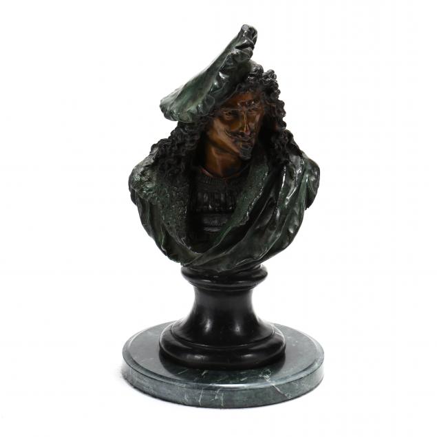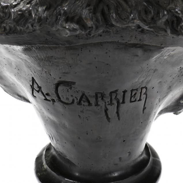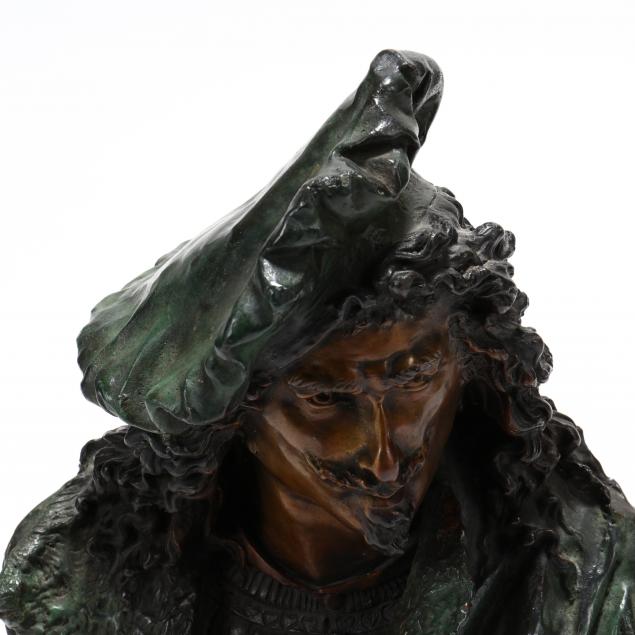20th century, patinated cast bronze, bearing signature "A. Carrier" to verso, the artist is depicted with curling hair and artist cap, dressed in a fur lined cloak, mounted to a round marble base.