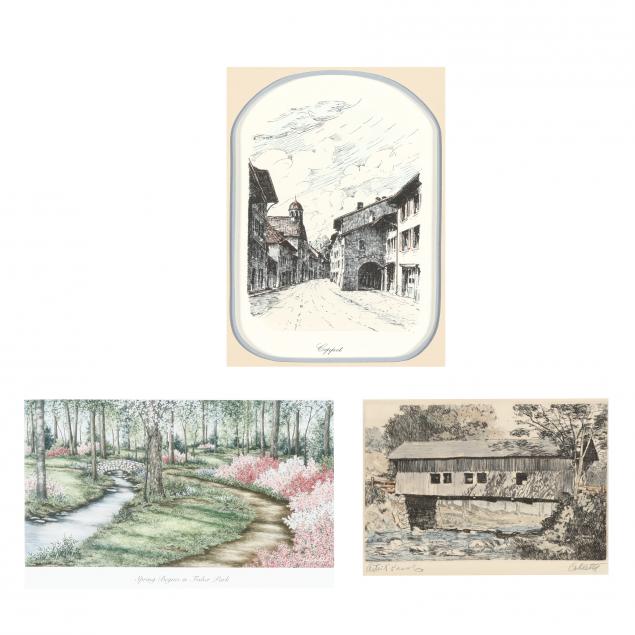 To include a hand-colored etching of a bridge by Carol Collette (Canada/HI, born 1945); a hand-colored print of Coppet, Switzerland, 20th century; and an offset print after Sherry Little Perini titled