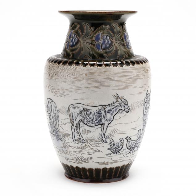 English, late 19th century, a stoneware vase, high shouldered form with flared neck and mouth, sgraffito decorated with farm animals, incised monograms, impressed 1688.